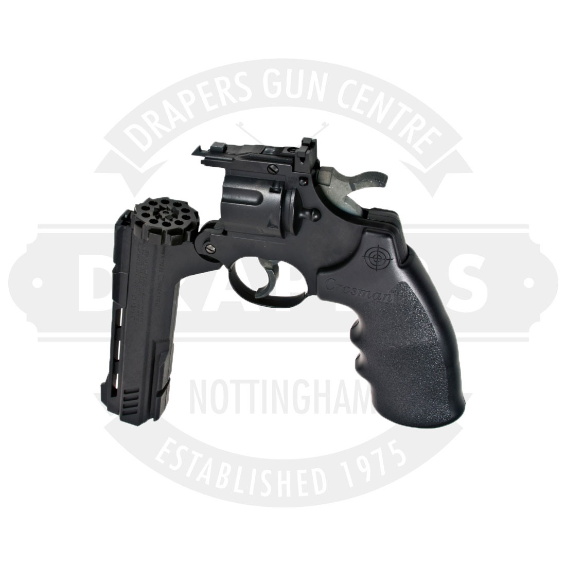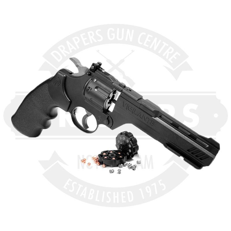 The Vigilante is a double action, semi-auto revolver that shoots pellets and BBs. Included is a 10-shot pellet clip and a 6-shot BB clip. Its powered by CO2 and shoots pellets up to 435 fps and BBs up to 465 fps through a 6-inch rifled steel barrel. The Vigilante has a fixed blade front sight and a fully adjustable rear sight. The dual accessory rails can accomodate picatinny or weaver mounts for attaching a scope, laser, or flashlight for the ultimate backyard plinking air pistol. -